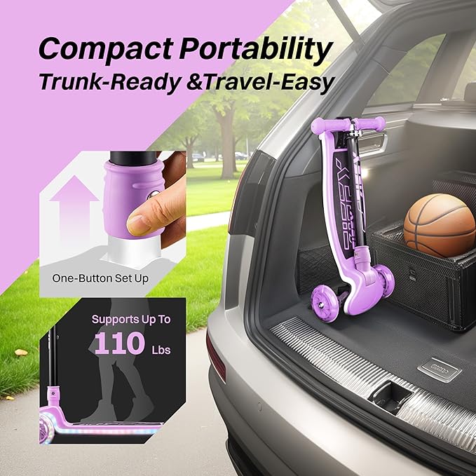 - Compact & Portable – No Assembly Required: Thoughtfully designed to grow with your child, this scooter requires no installation and features a 4-level adjustable handlebar (25.5 / 29.1 / 31.1 / 32.6 inches), ensuring a comfortable fit for years to come. The one-step folding system and lightweight design make it easy to carry and store—perfect for trips to the park, school, or family vacations.